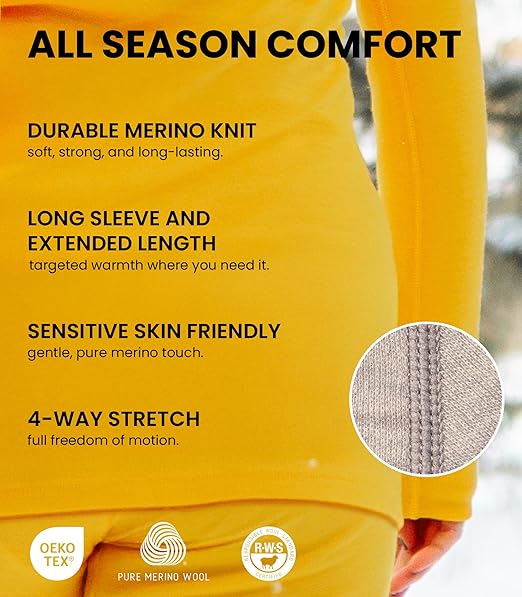 The Merino.tech women’s merino wool base layer uses natural merino fibers that wick moisture, regulate temperature, and resist odor buildup — allowing comfortable wear during hikes, travel days, or relaxing around camp.